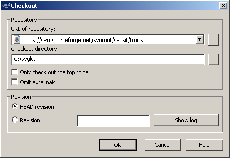 svn co https://svn.sourceforge.net/svnroot/svgkit/trunk svgkit - Windows using TortoiseSVN: After installing, right click where you want to check it out, select "SVN Checkout..." and type the url